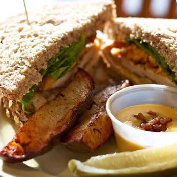 Sautéed Chicken, Fresh Spinach, Bacon, Cheddar Cheese, & Honey Mustard - choice of bread, shown with cottage fries -